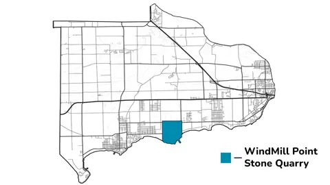 The community that existed around Stonemill Road between Lake Erie and Garrison Road was called both Windmill Point and Stone Quarry depending on the industrial base of the time. In 1886, a post office was granted in the name of Stone Quarry. This quarry, (c. 1911) located at Windmill Point, operated from 1895-1903 by Hughes Brothers and Bangs of Syracuse. (Stone Quarry)