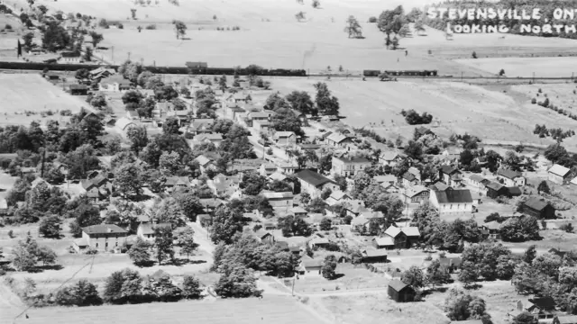 The early settlers of Stevensville capitalized on the natural surroundings for early commercial growth. The abundant forests allowed for a large timber and mill trade and two rail lines boosted the community’s economy by 1886. The decline of Stevensville as a commercial center is tied to the railway’s decline in importance. This aerial photo looks north over the community. A school is visible near the bottom left corner. (Photo A)