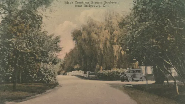 This community acted as a midpoint stop for travelers going between the larger towns of Fort Erie and Niagara on the Lake. When townships were abolished in 1970, the boundaries of Black Creek became part of greater Fort Erie. The photo shows the view of Niagara Boulevard looking south just before the bridge over Black Creek. (Photo B)