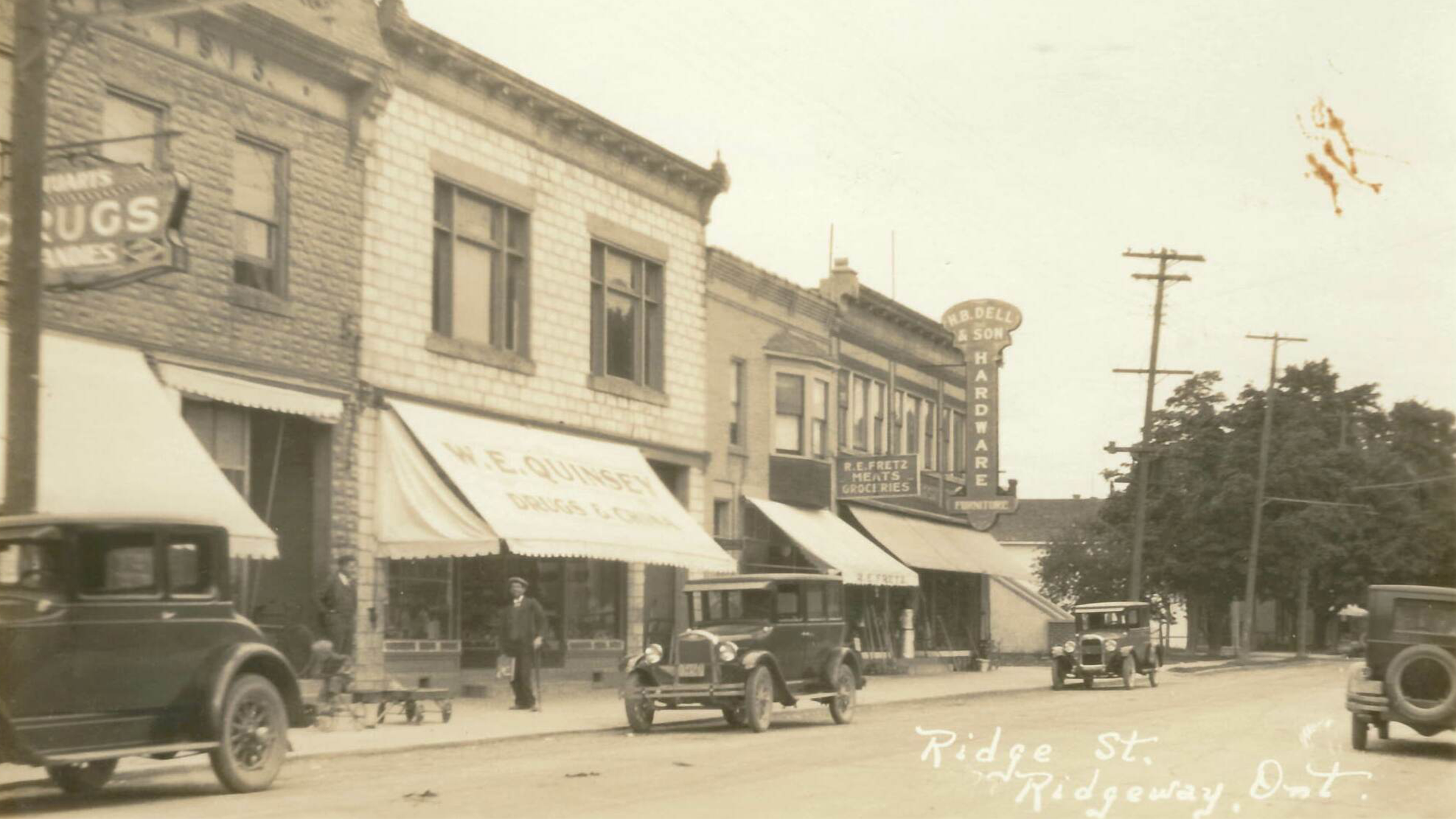 The prosperity of Ridgeway did not depend on a single industry as other communities in the area did. Instead, it grew as a diversified commercial village due to the proximity of the rail line. A number of industries developed around the train stop on Ridge Road to serve passengers. Ridgeway was also the seat of municipal government for Bertie Township until the amalgamation in 1970. This is a view of the west side of Ridge Street (Ridge Road) in the 1920s. (Photo B)